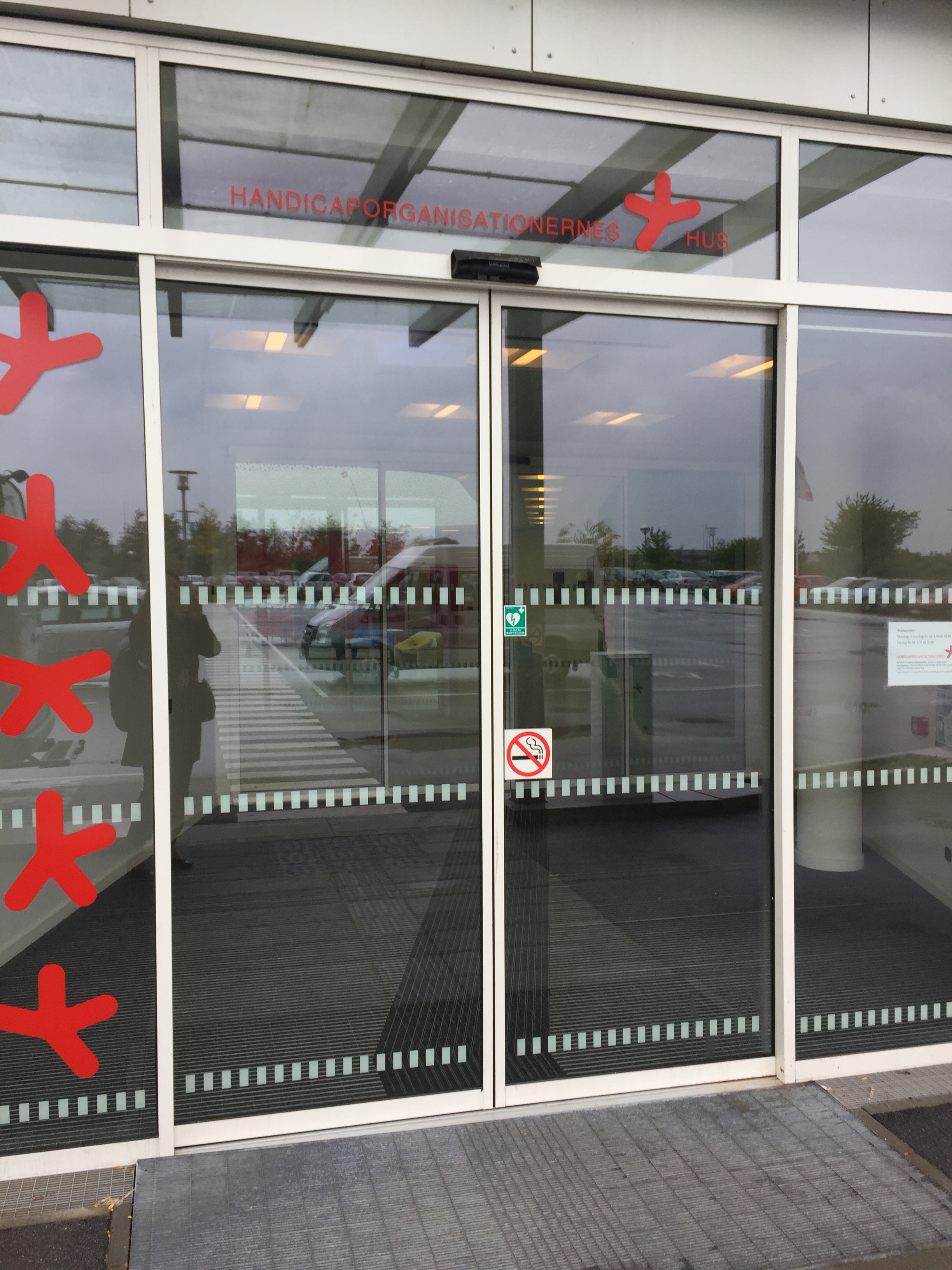 Bildet viser hovedinggangen til Handicaporganistionernes Hus. På utsiden var det lagt ledelinjer, og på innsiden var det lagt tepper som ble brukt som naturlig ledelinje.