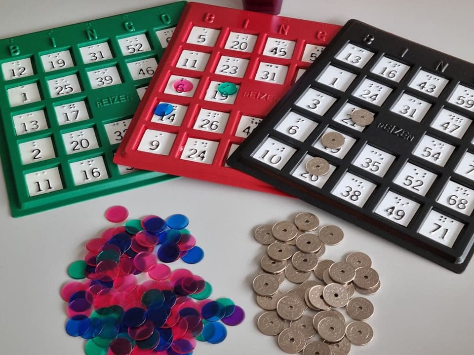 Vi bruker bingobrett som er med taktiletall, punkt og svarte tall så alle kan være med å spille. Vi bruker fargete gjennomsiktige plast brikker eller kronestykker som legges på brettet på det tallet som blir lest opp.