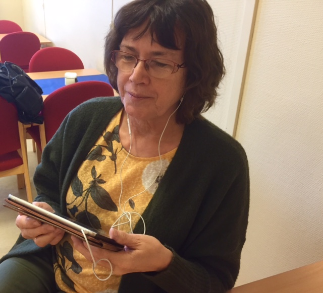 Fylkeslagsleder Brit B Eikehaug leser lydavisa.