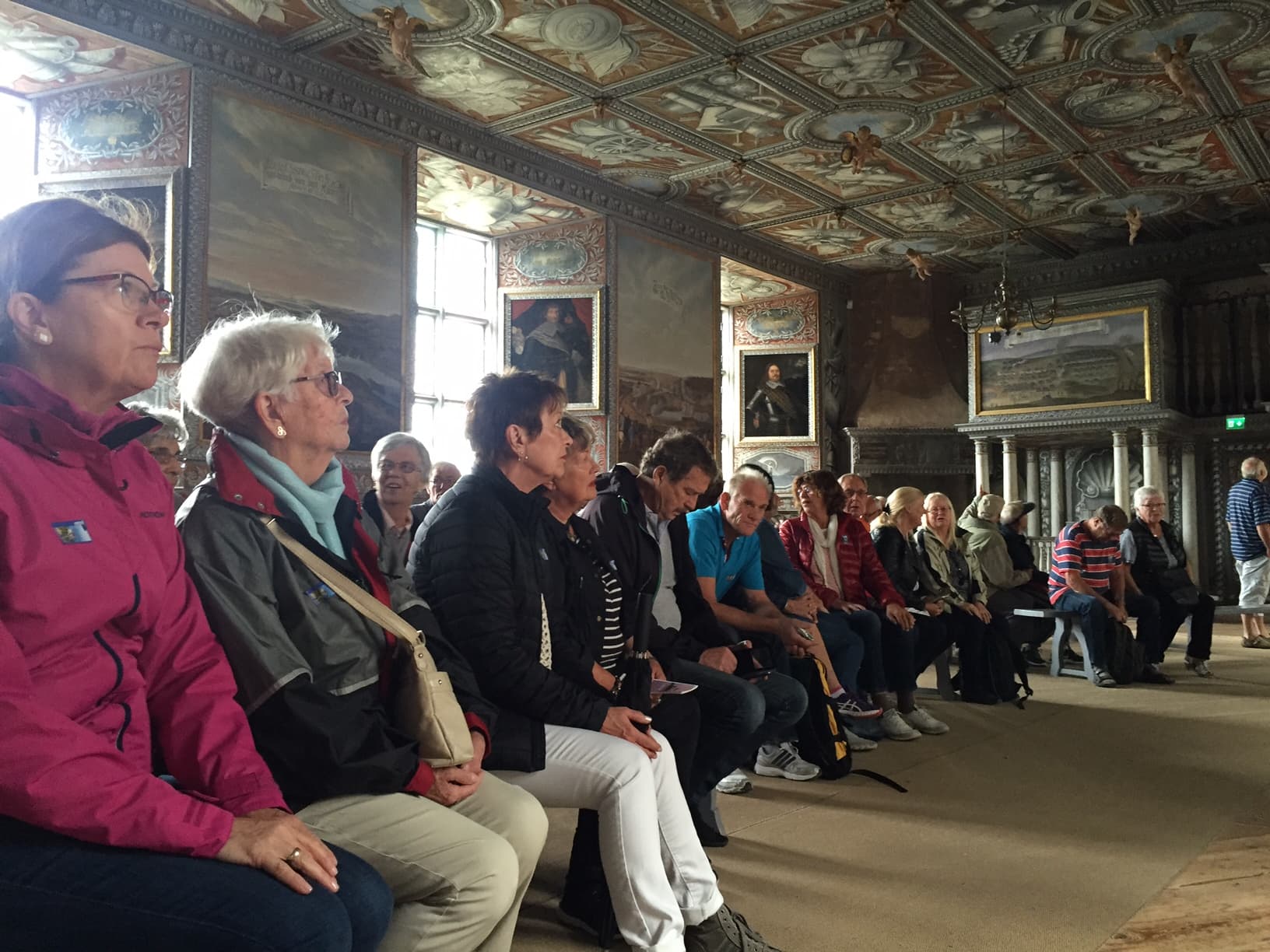 Her sitter en lydhør gjeng i Lackø slott og følger med på hva gaiden forteller.