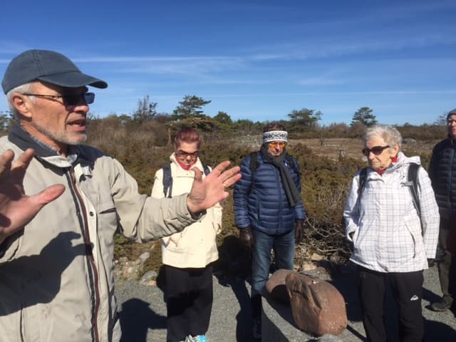 Knut Rimstad fra Brunlanes historielag fortalte levende og inspirerende om slaget ved Nesjar og om det nye minnesmerket om slaget som er reist på brygga i Helgeroa. Gjengen besøkte geo-parken ved Mølen og fikk høre om hvordan isen hadde formet landskapet.