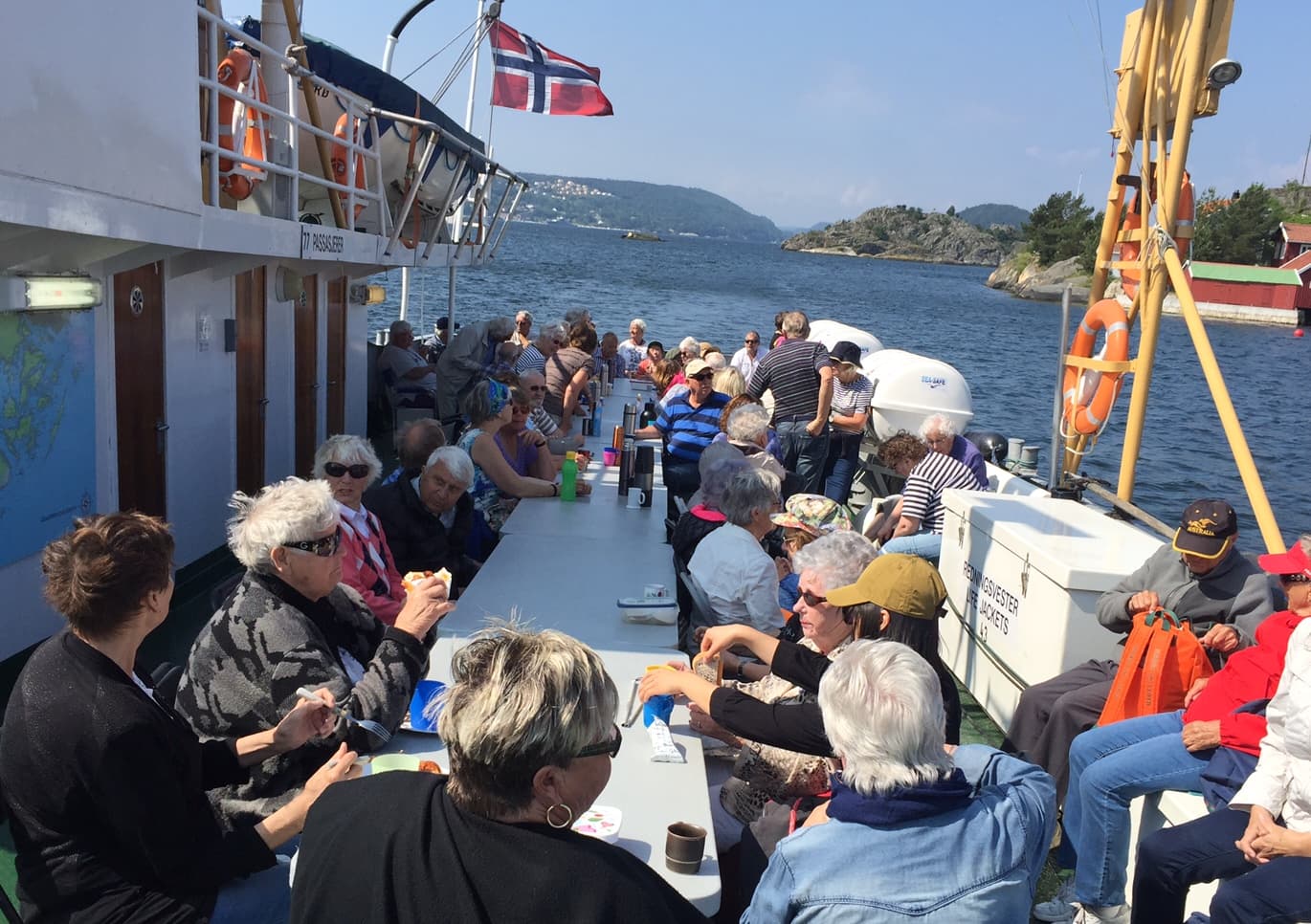 Bilde viser glade turdeltagere ombord i den freda fergen Gamle Kragerø.