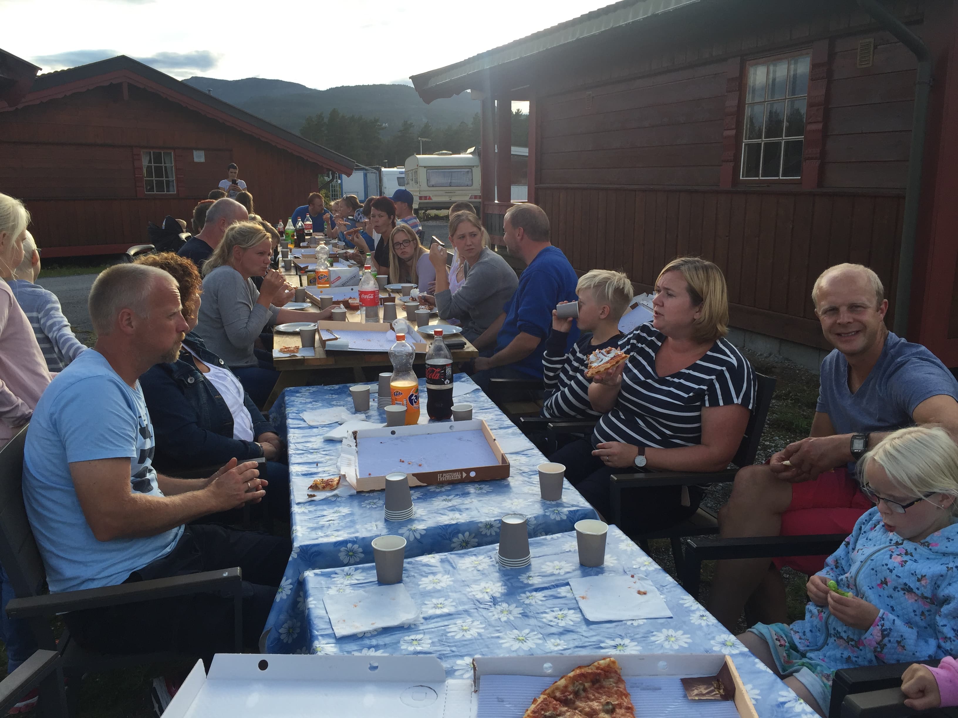 Her koser gjengen seg med pizza utenfor hyttene ved Bø camping.