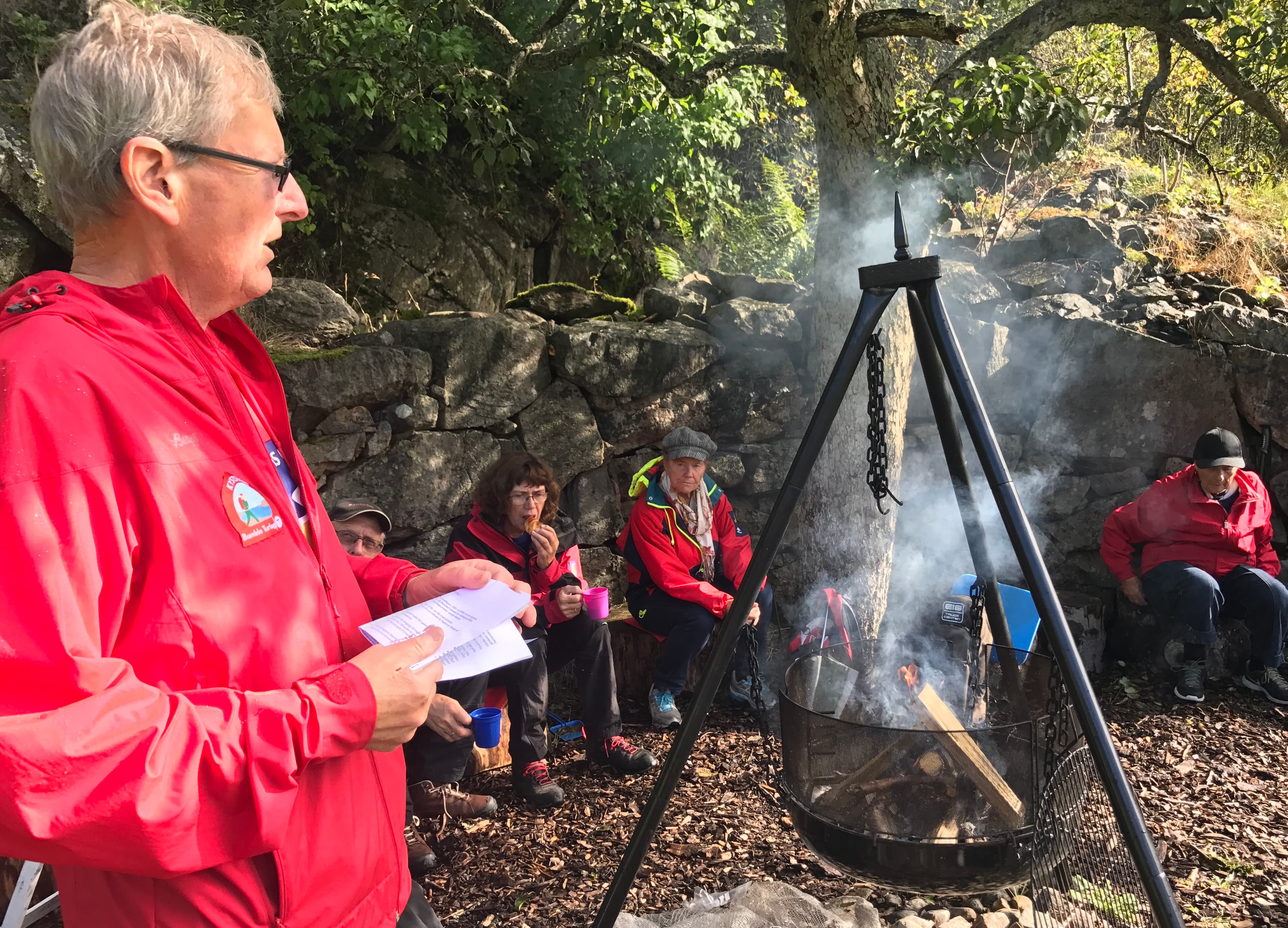 Odd Nakkestad fra Bamble turlag var med som gaid og fortalte om kyststien og om historien rundt plassen Ødegård. På 1700 tallet ble det plantet en stor frukthage og man tror at det fortsatt er noen få trær fra denne perioden i hagen. I hagen var det tent opp bål og alle fikk smake på frukt fra hagen. Det ble også servert kake, stor takk til Anna som overrasket oss med denne. Turen ble en skikkelig fin sanseopplevelse. Herlig flott natur, hanegal og måkeskrik. Gjengen var også utrolig heldig med været.