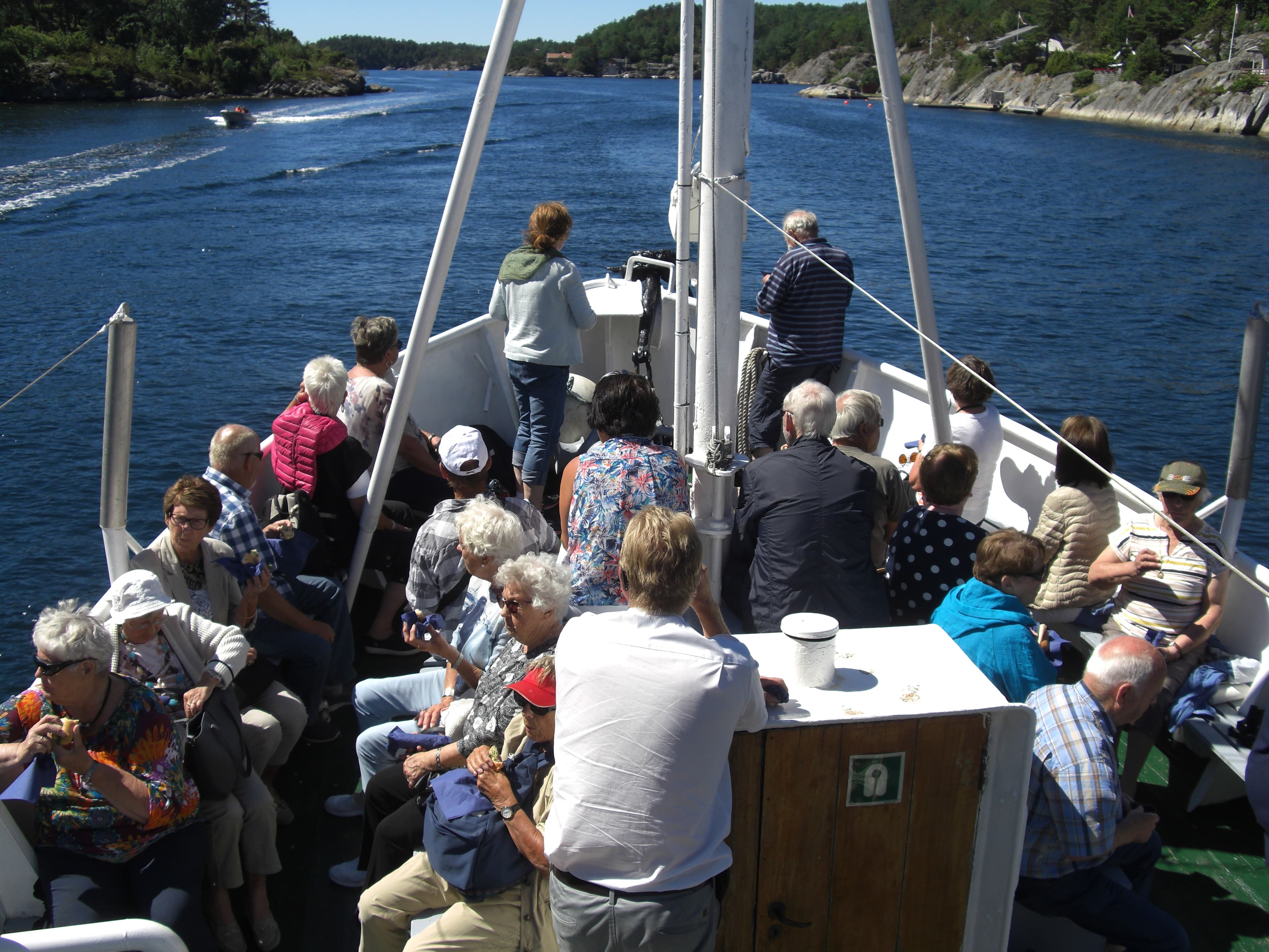 Med buss fra Grenland ble det kaffestopp i Søndeled før gjengen ankom Lillesand og gikk om bord i turistbåten Øya. Her fikk man oppleve motordur, måkeskrik og herlig duft av sjø og sommer. Etter en to timers båttur ble det servert middag på Hotell Norge. Og så gikk turen tilbake til Telemark via ytre kystvei fra Arendal til Tvedestrand. Det ble en flott tur og alle storkoste seg. Turen var sommeravslutning for Grenland lokallag, som holder til på Vestsiden velferdssentral i Porsgrunn. Første møte etter ferien blir 13. september. Alle hjertelig velkommen.