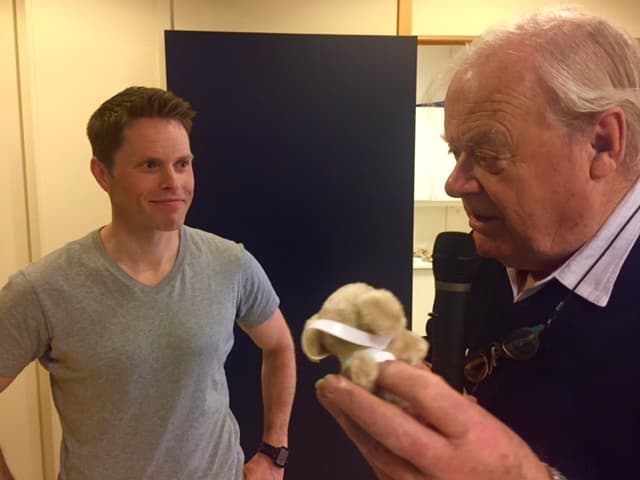Svenn Thore Oredalen (til høyre) overrekker en liten førerhund som takk til øyelege Ruben Andersen.