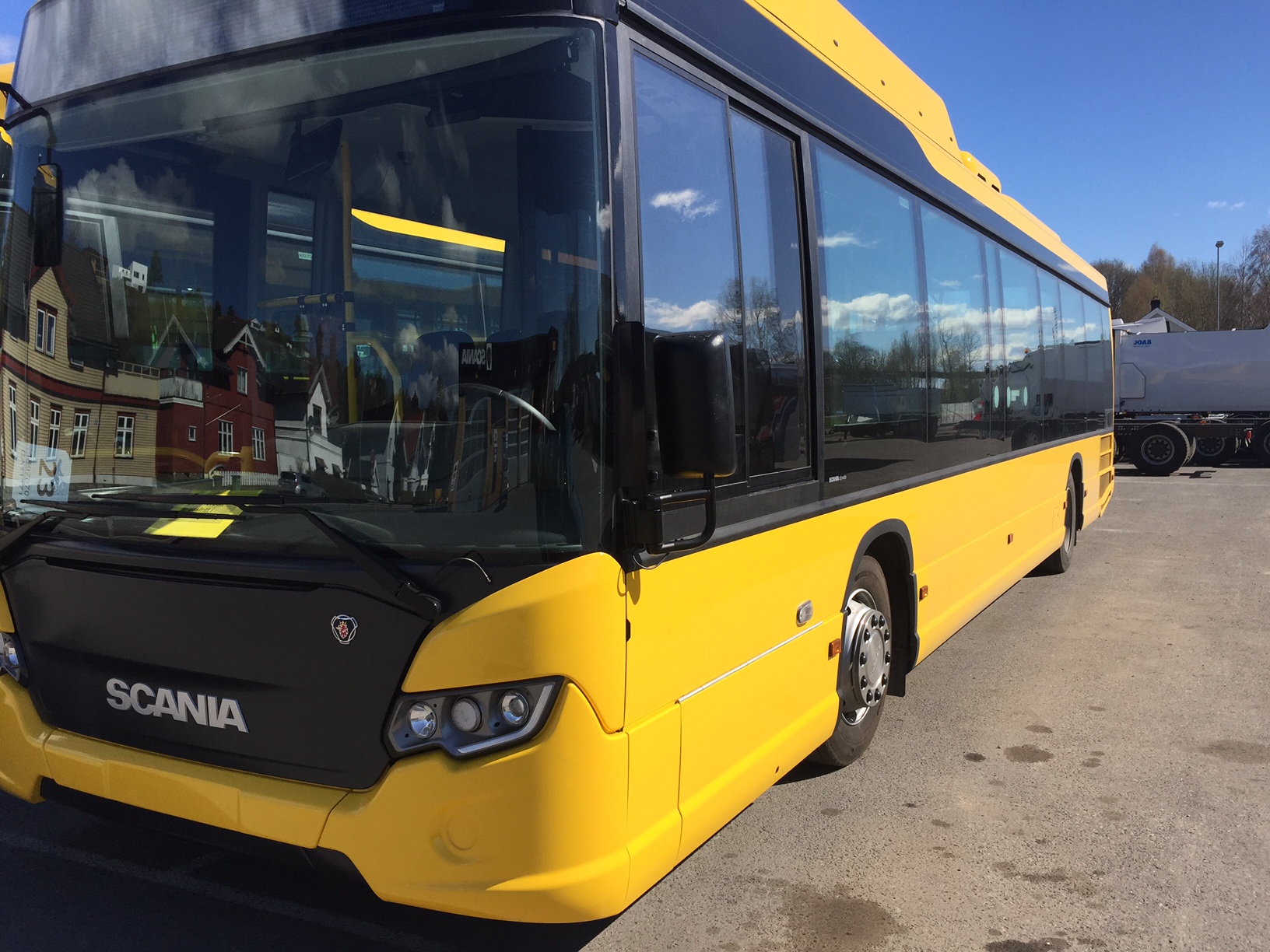 Bilde viser en av Telemark fylkeskommunes nye gule busser.