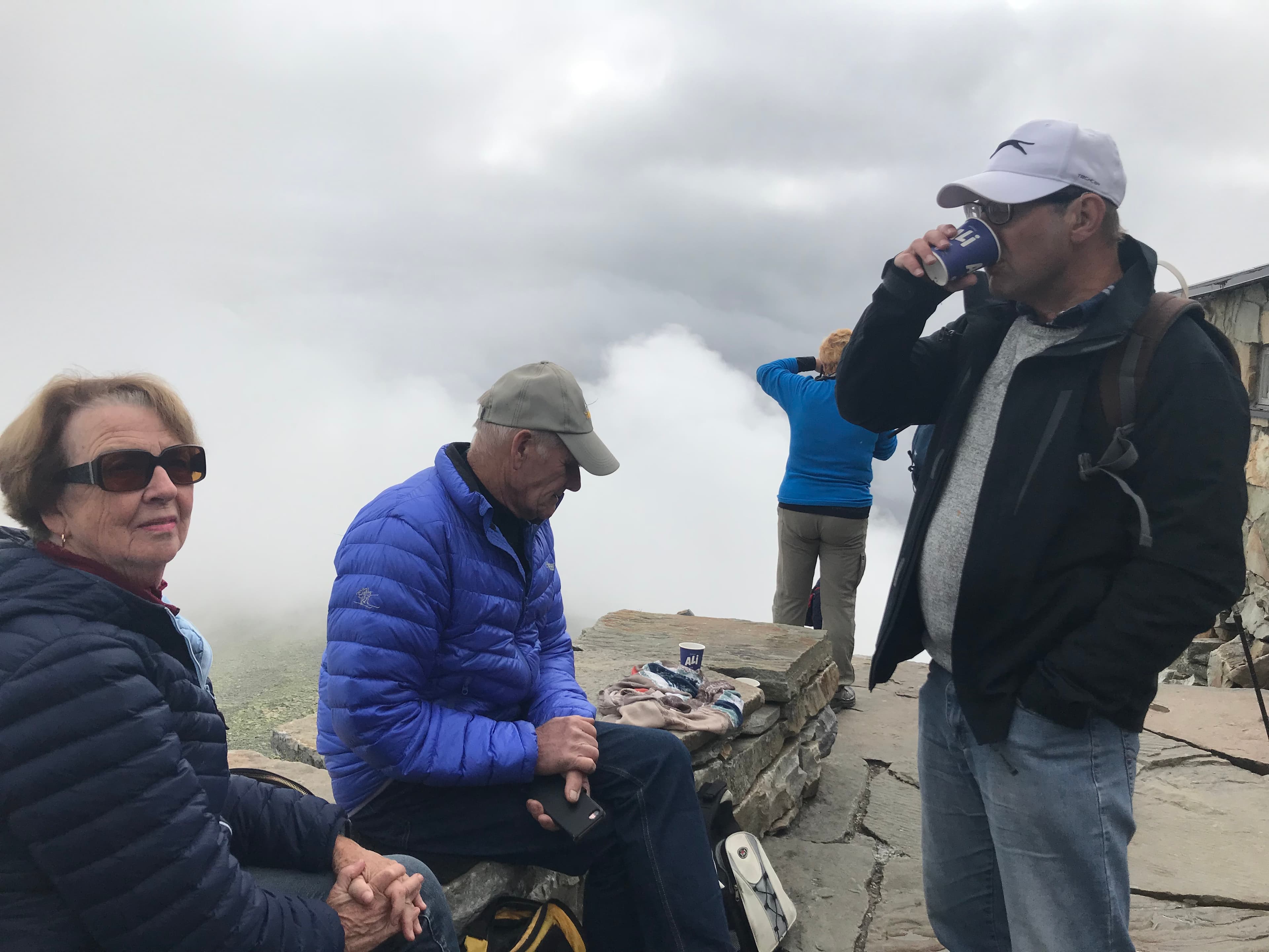 Kaffepause på toppen fra venstre Solveig Aasmundsen fra Lunde og Jonn Aasmundsen fra Lunde og Torgeir Skogli fra Kragerø.
