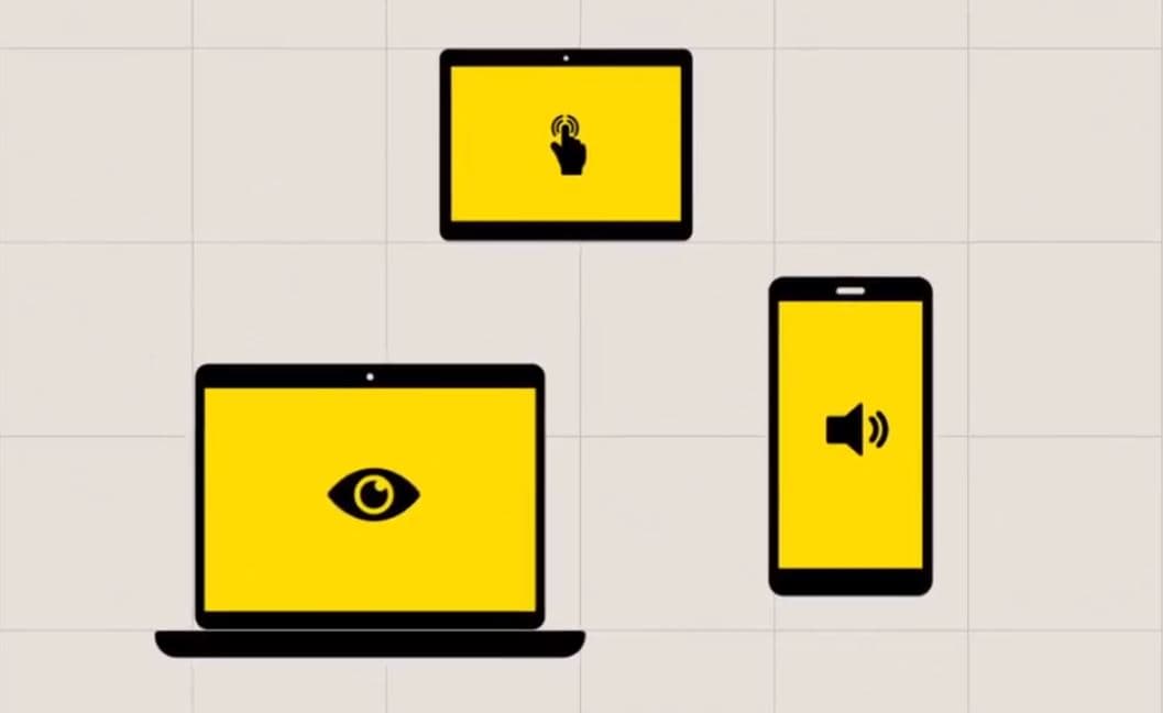 Skjermbilde fra filmen "Inkluderende arbeidsliv". Viser PC, nettbrett og smarttelefon med symboler for universell utforming.