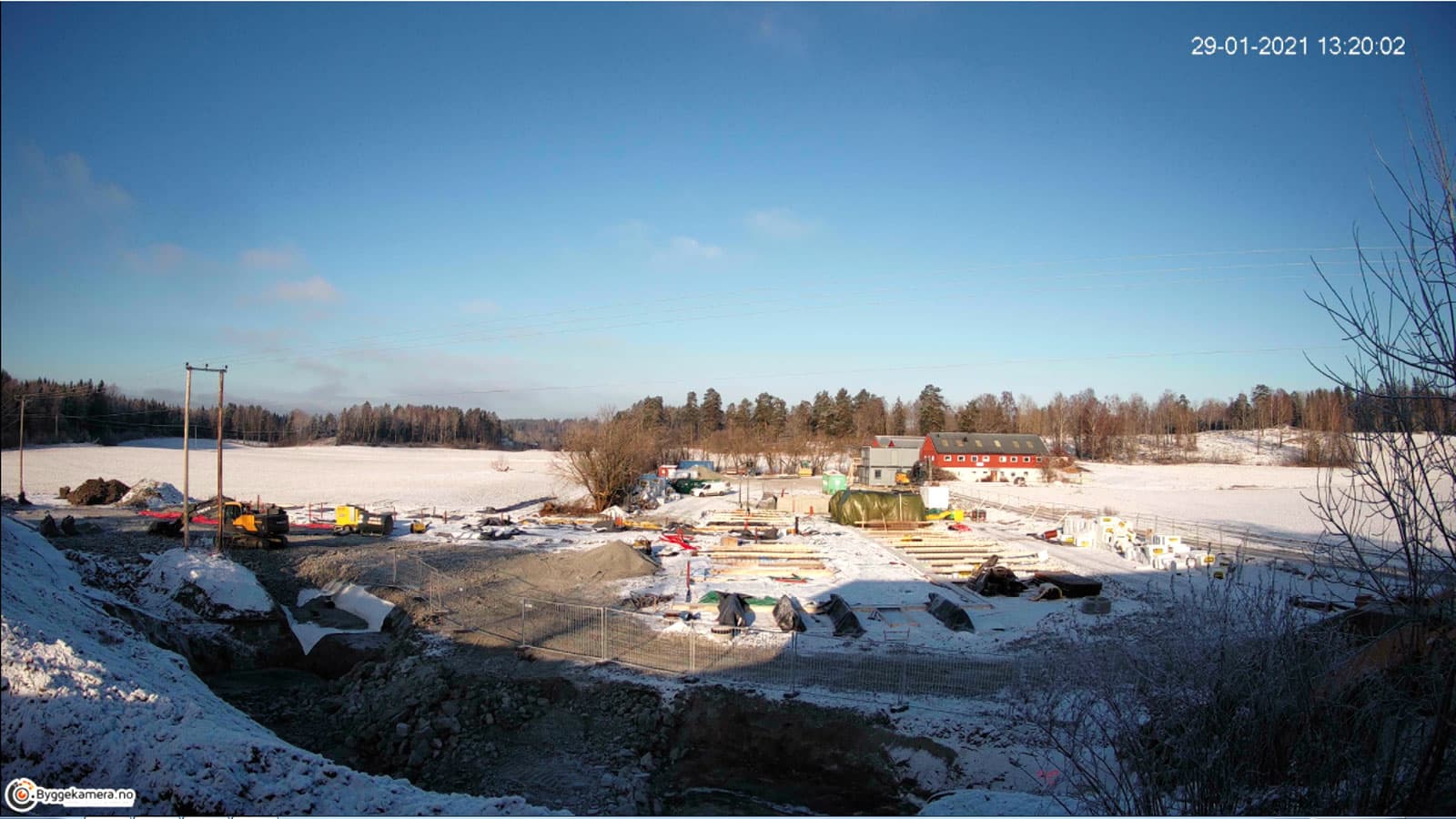 Bilde fra byggeplassen: I midten av bildet vil inngangspartiet til anlegget komme. Bakerst i bildet er det skog, rundt byggeplassen er det jorder og noen låvebygninger. På byggeplassen er det anleggsmaskiner og hauger med jord. (Nederst i denne saken finnes det oppdatert bilde fra byggeplassen)