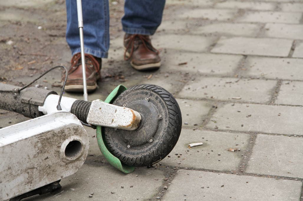 Illustrasjonfoto av en veltet el-sparkesykkel og en person med hvit stokk