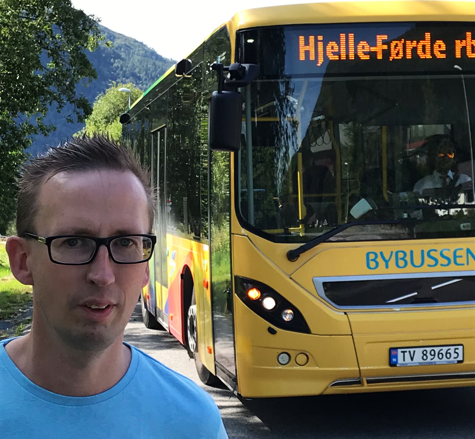 Bilde av Lars Erik framfor en rutebuss i Førde. Foto: Privat