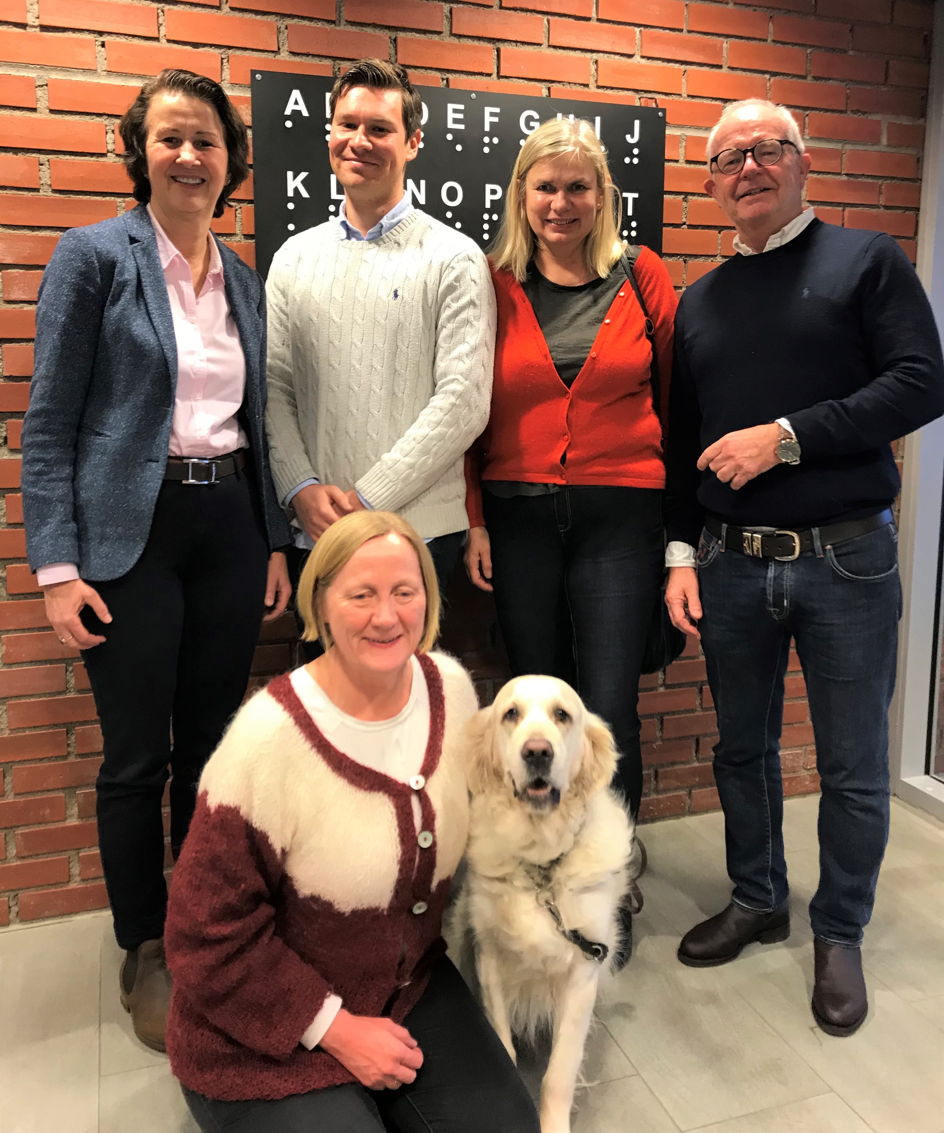Bilde av Elisabeth Aase og Håkon Waage fra Aase Byggeadministrasjon, forbundsleder Unn Ljøner Hagen, markedssjef Knut Blütecher og Sølvi Ørstenvik fra styret i Veiviseren + Sølvis førerhund Fryd.