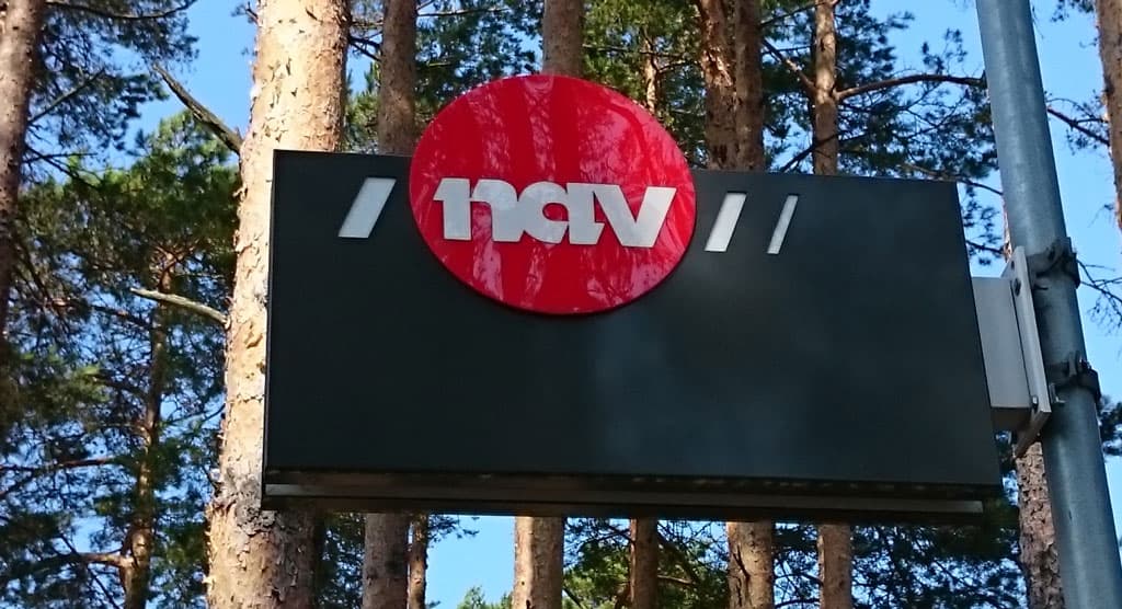Bilde av skilt utenfor et NAV-kontor.