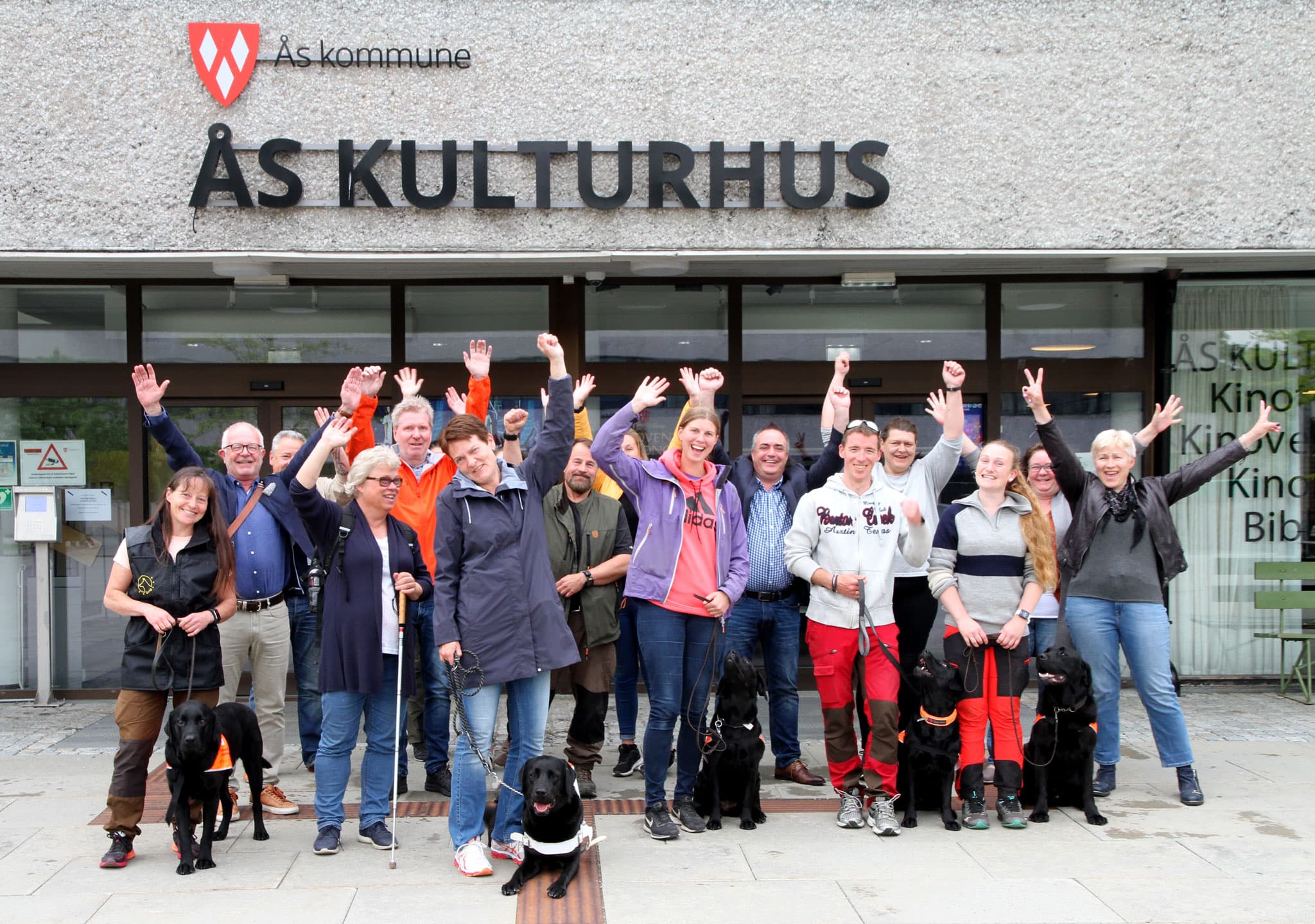 En hoppende glad gjeng med medlemmer, støttespillere, ansatte og forverts- og førerhunder foran inngangen til Kulturhuset i Ås.