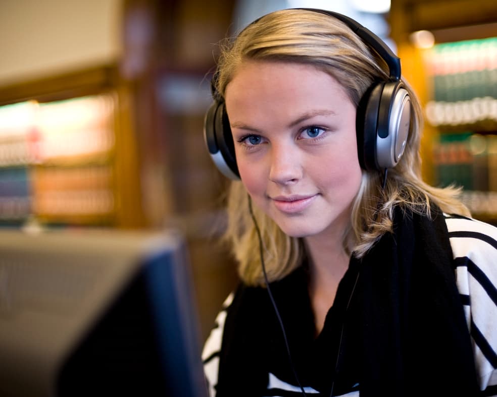Bilde av ung kvinne med hodetelefoner. Foto: Rolf Estensen