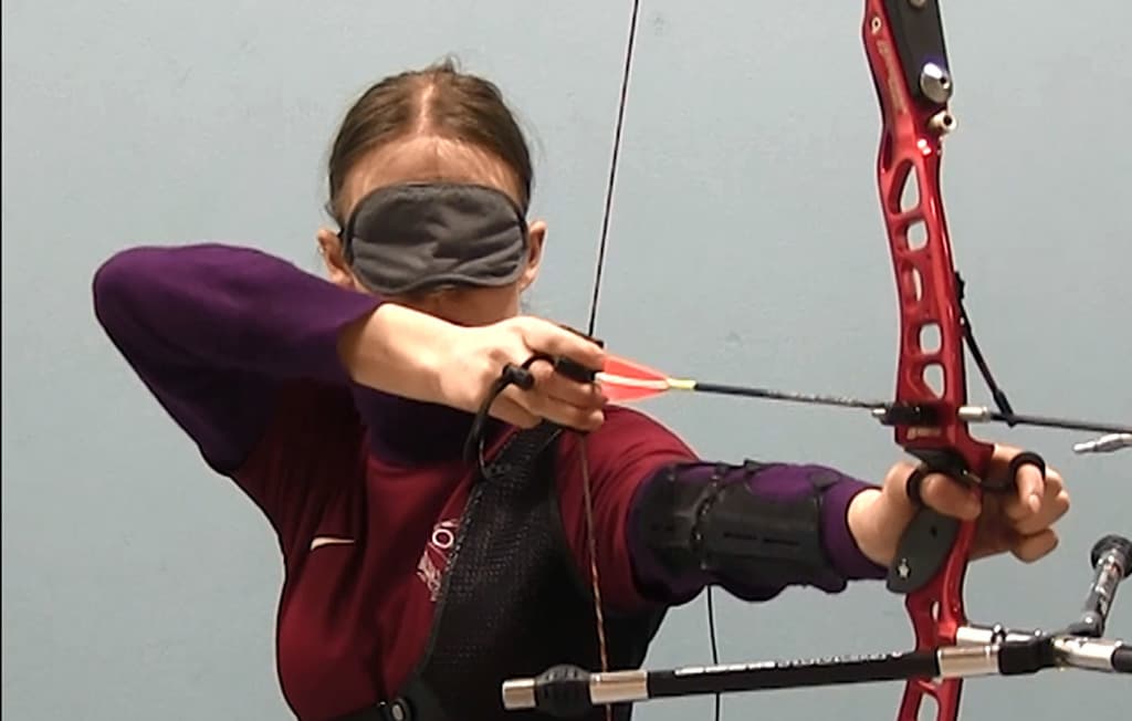 Illustrasjonsbilde: Skjermdump fra film med en synshemmet bueskytter. Personen har øyemaske på og pilen klar på buen.