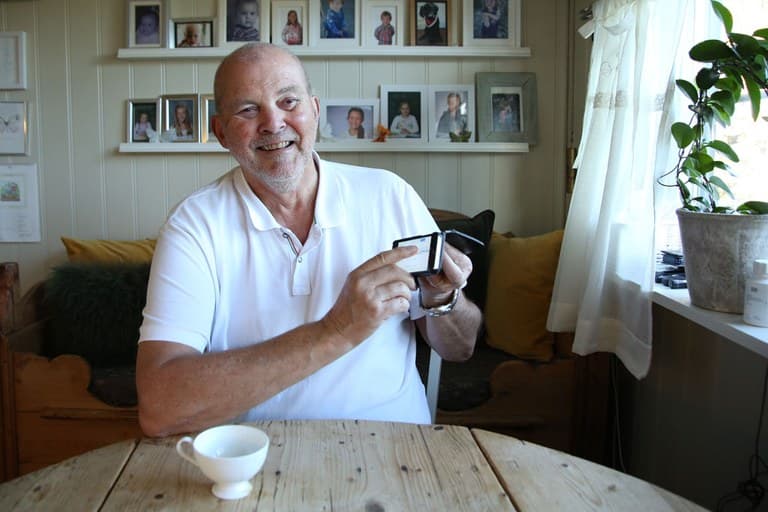 Takket være teknologien har Per Werner Larsen fått et enklere diabetesliv. Han får blodsukkermålingene sine opplest av smarttelefonen sin. Blodsukkernivået hans måles jevnlig av en probe i armen hans. Resultatet sendes til smarttelefonen hans som leser det opp for han.